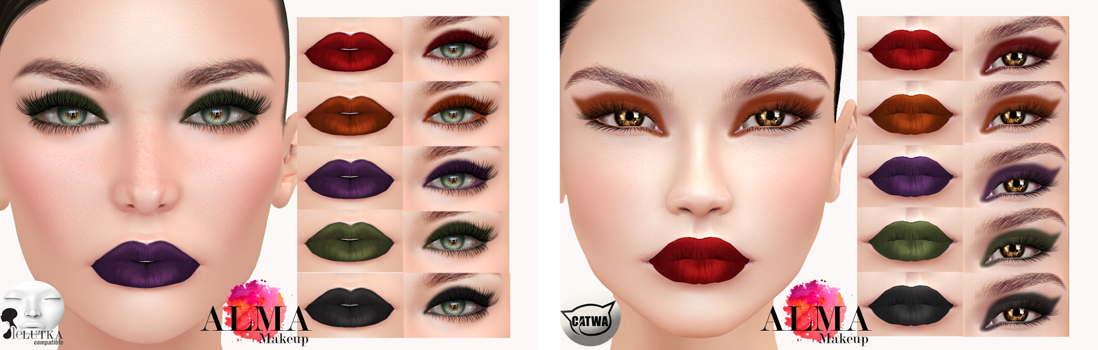 Dark Romance for Lelutka and Catwa heads comes with 5 eyeshadows and 5 lipsticks. The colour included are: Red, Burnt Orange, Purple, Mossy Green and Dark Grey.